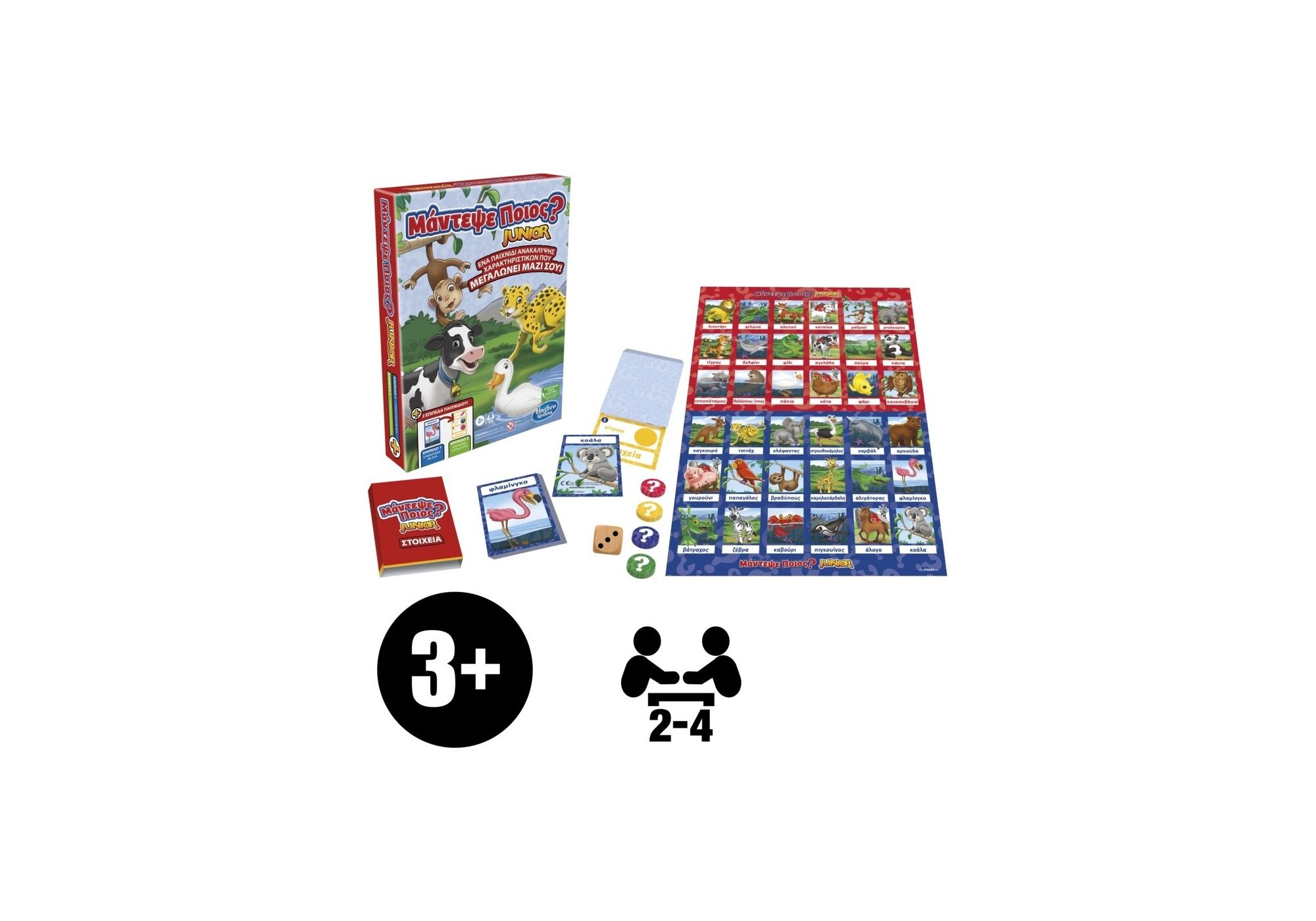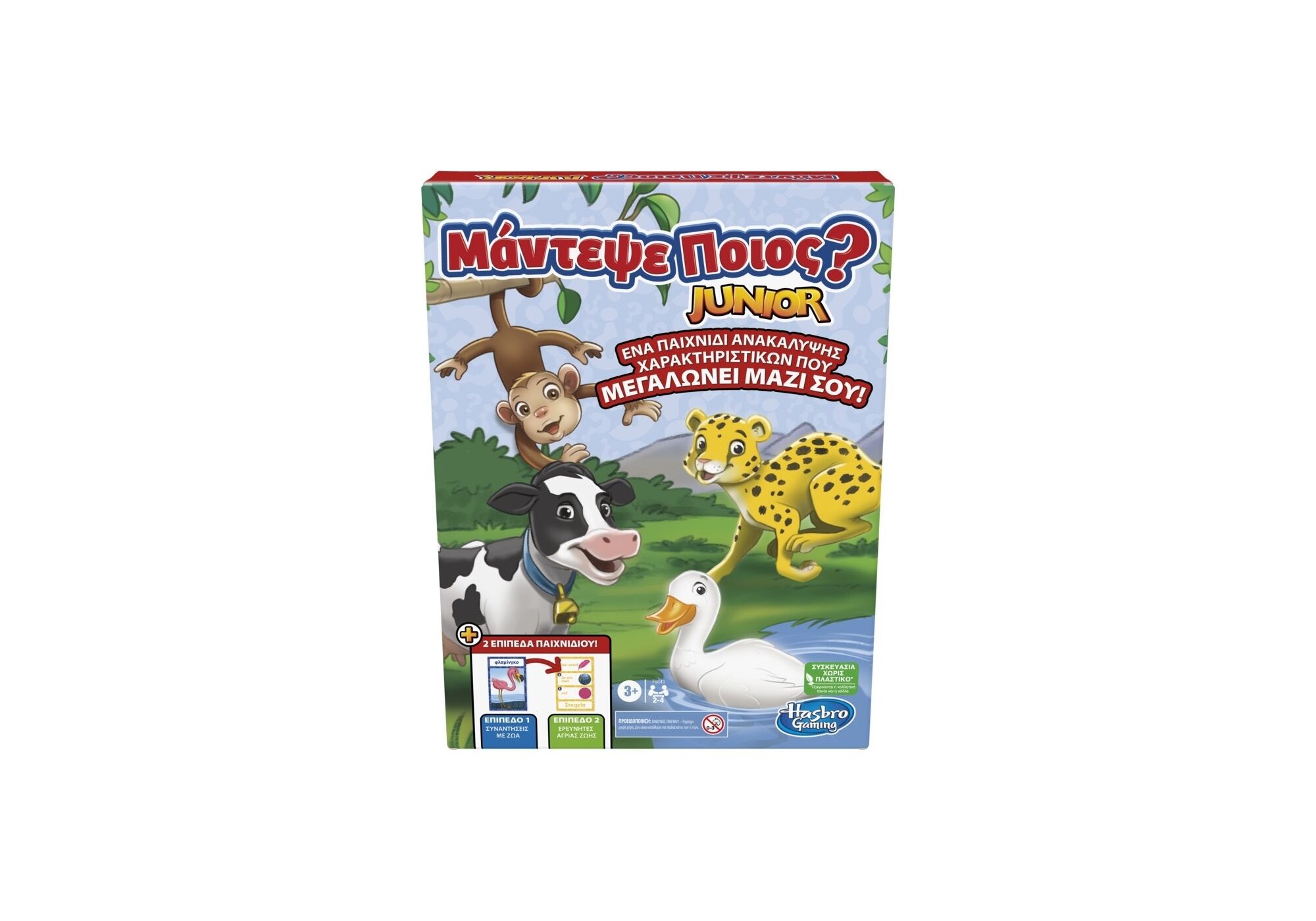 Απολαύστε 2 παιχνίδια σε 1! Το επιτραπέζιο παιχνίδι Μάντεψε Ποιος Junior είναι το παιχνίδι εύρεσης χαρακτηριστικών ζώων που μεγαλώνει με το μικρό σας. Επιλέξτε ανάμεσα σε 2 επίπεδα. Στο επίπεδο 1 (αρχάριοι), οι παίκτες ξεκινούν μια περιπέτεια ζώων, χρησιμοποιώντας 3 στοιχεία για τα χαρακτηριστικά ενός ζώου. Το επίπεδο 2 (προχωρημένοι), προσφέρει περισσότερη πρόκληση. Οι παίκτες ρίζνουν το ζάρι για να καθορίσουν πόσα στοιχεία μπορούν να αποκαλυφθούν. Σε κάθε παιχνίδι, ο πρώτος που θα ανακαλύψει 5 ζώα κερδίζει! Και τα δύο παιχνίδια μπορούν να παιχτούν χρησιμοποιώντας οποιαδήποτε πλευρά του αναδιπλούμενου ταμπλό ή ολόκληρου του ταμπλό.